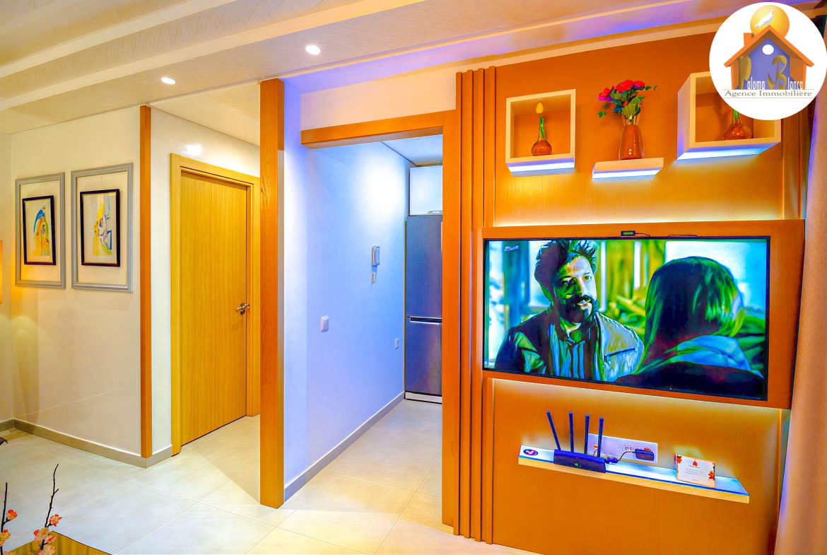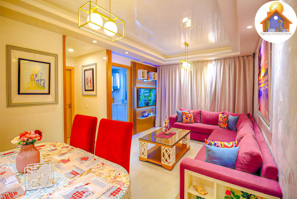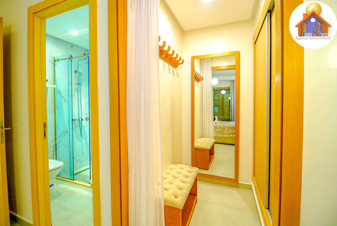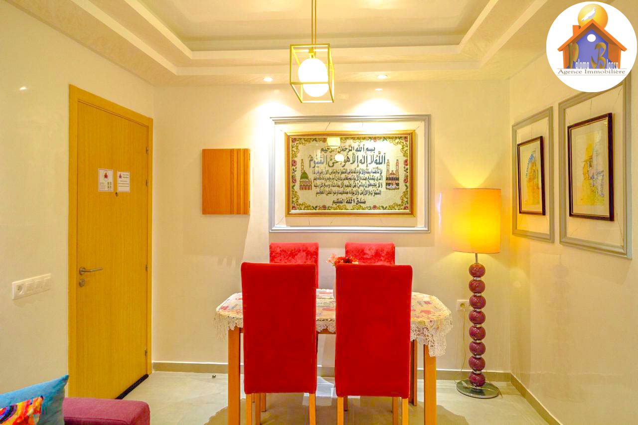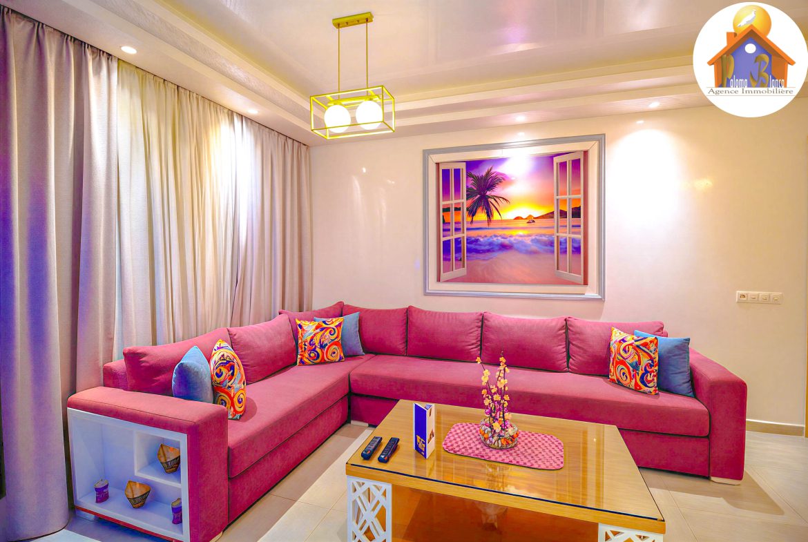 Cet appartement est en 3ème étage Avec Ascenseur, meublé avec goût et composé de : 1 Chambre à coucher  ,1 grand salon avec salle à manger , 2 SDB , Cuisine bien équipée , Grande Terrasses .