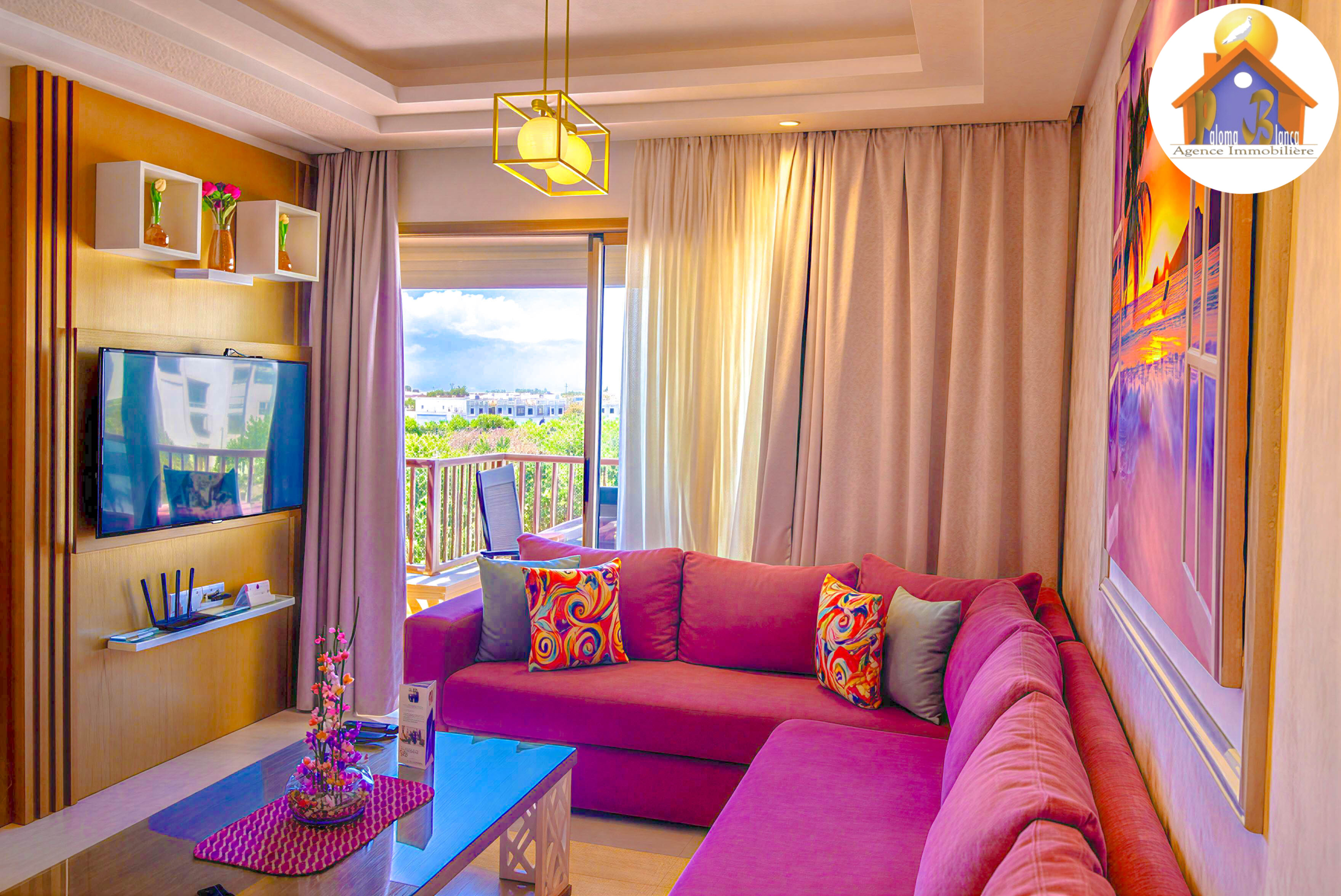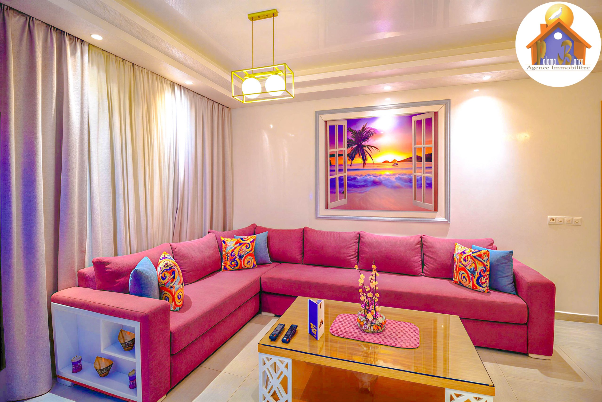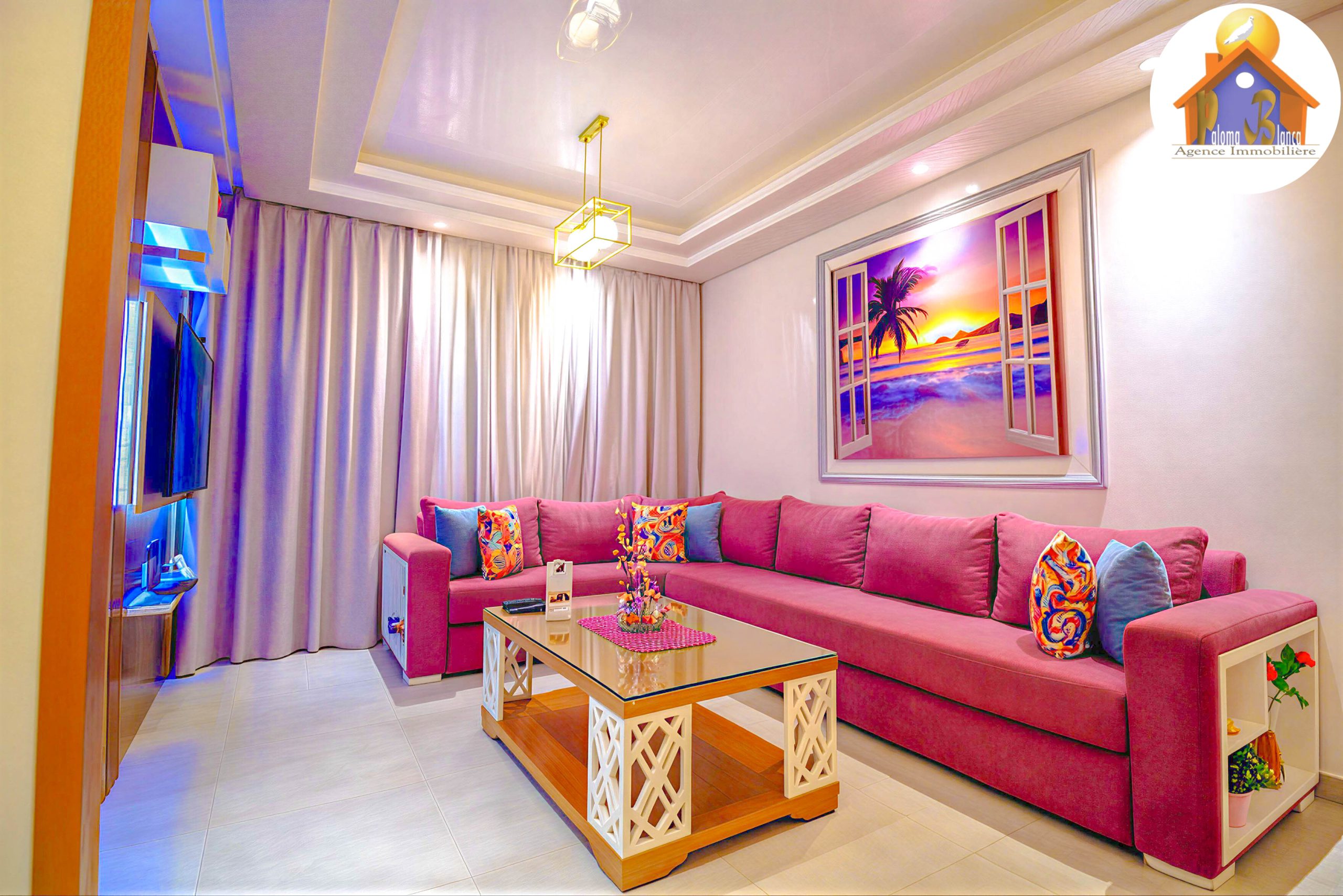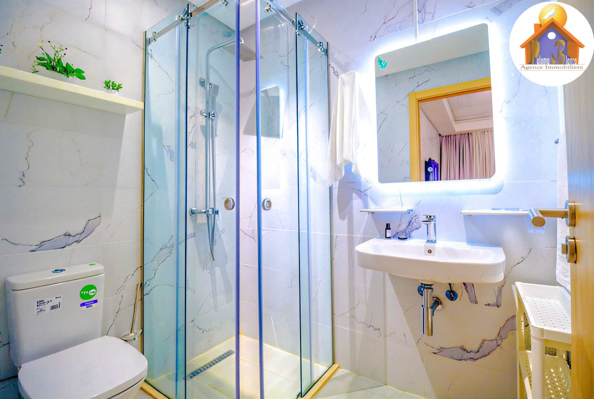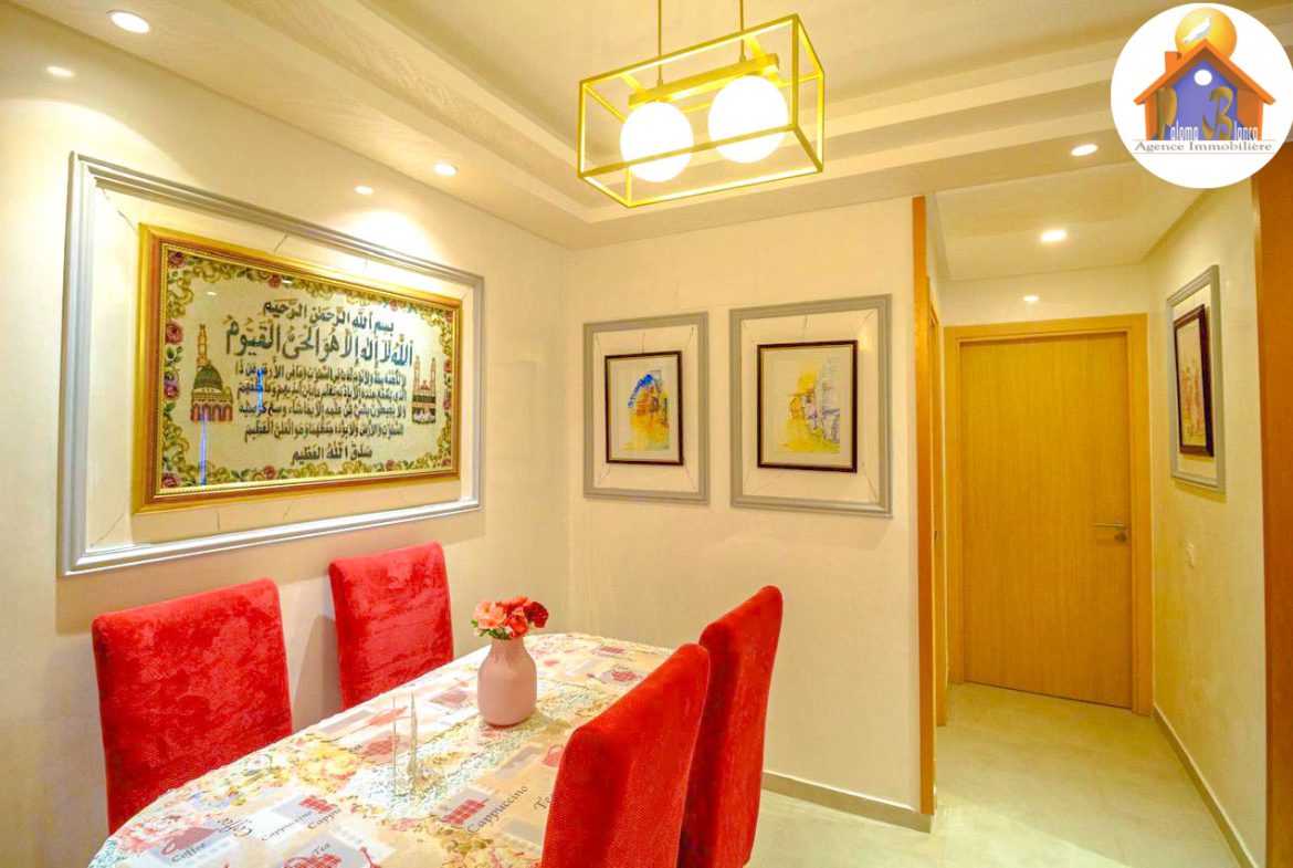 Cet appartement est en 3ème étage Avec Ascenseur, meublé avec goût et composé de : 1 Chambre à coucher  ,1 grand salon avec salle à manger , 2 SDB , Cuisine bien équipée , Grande Terrasses .