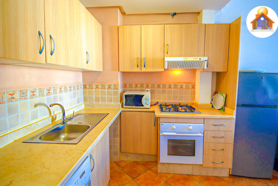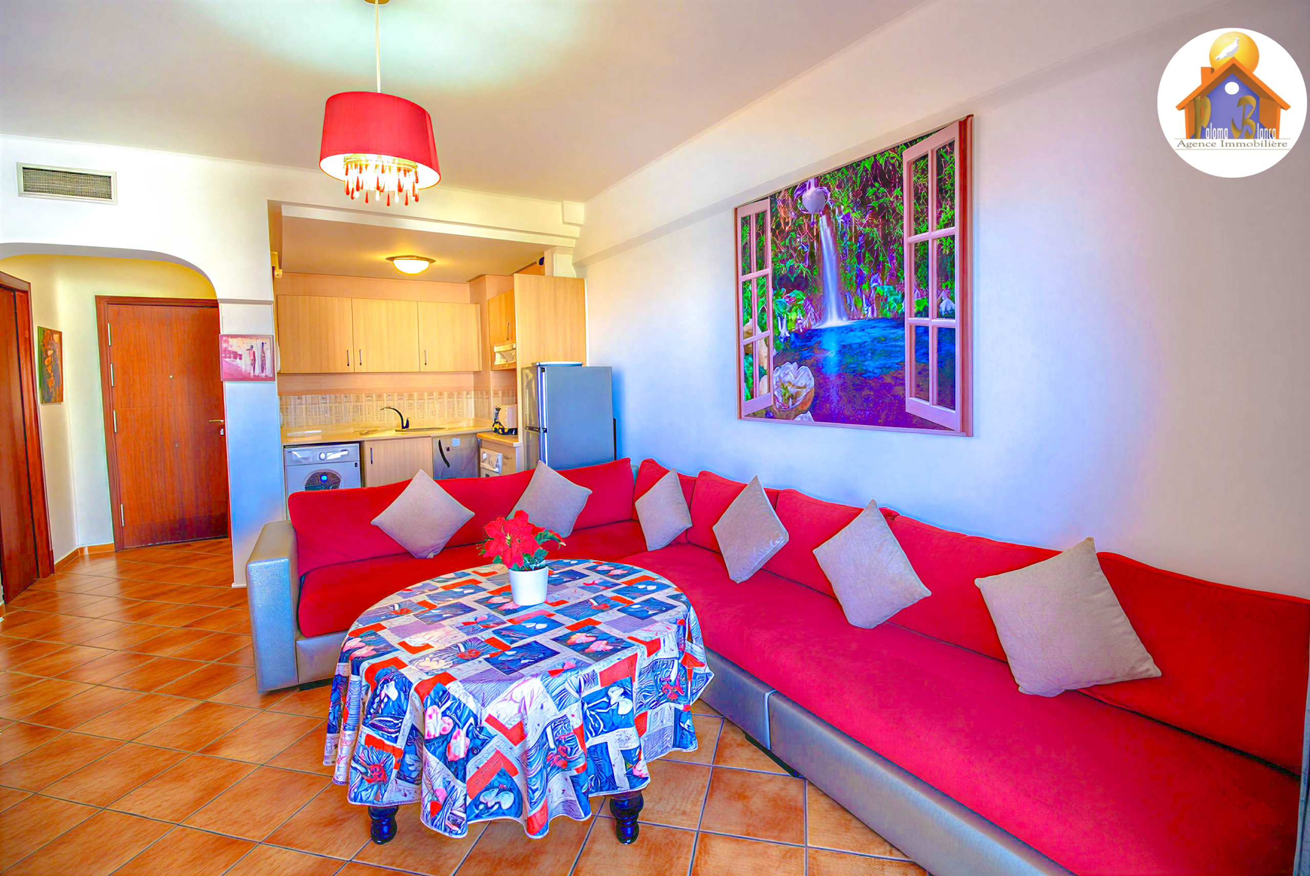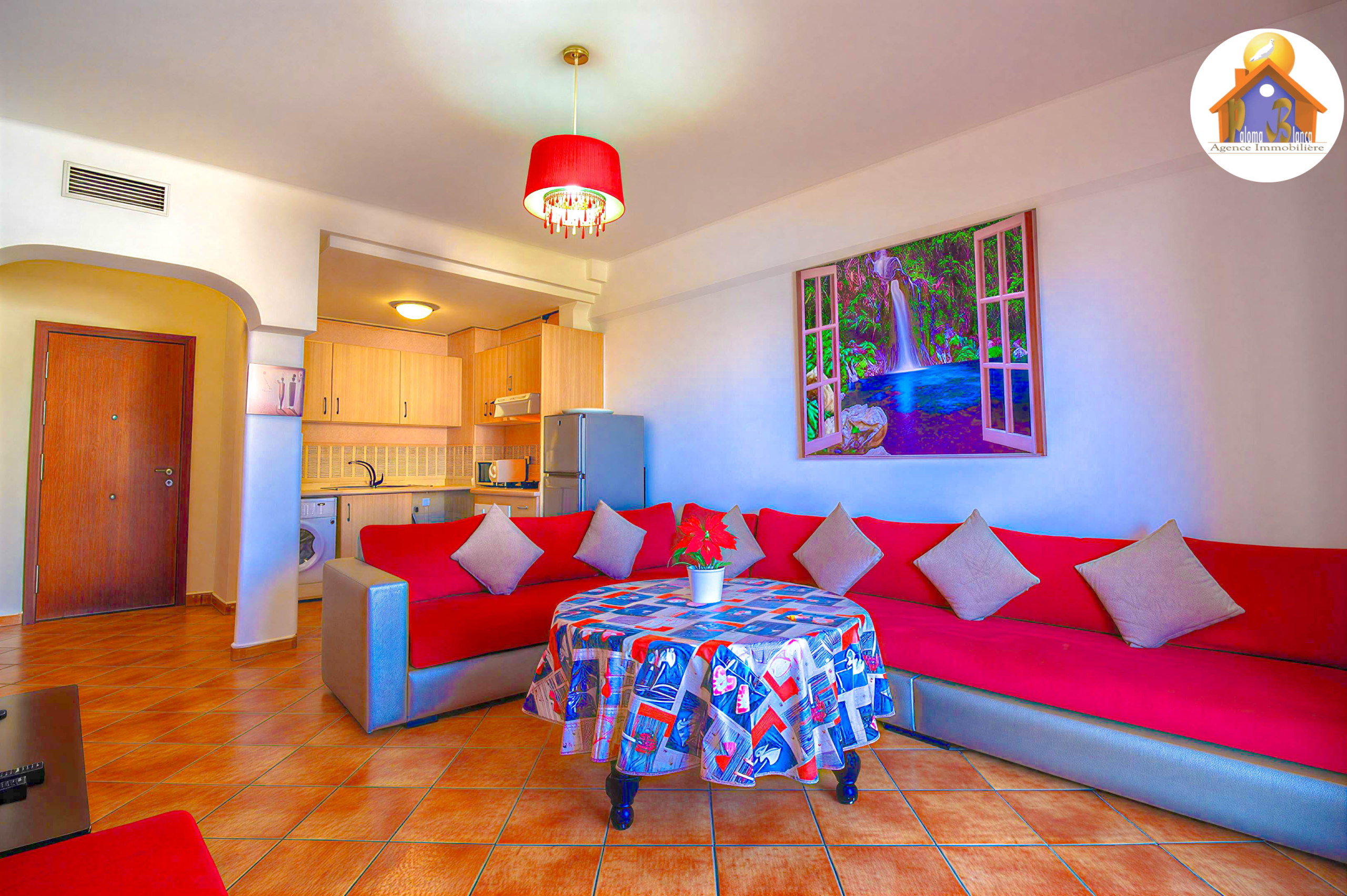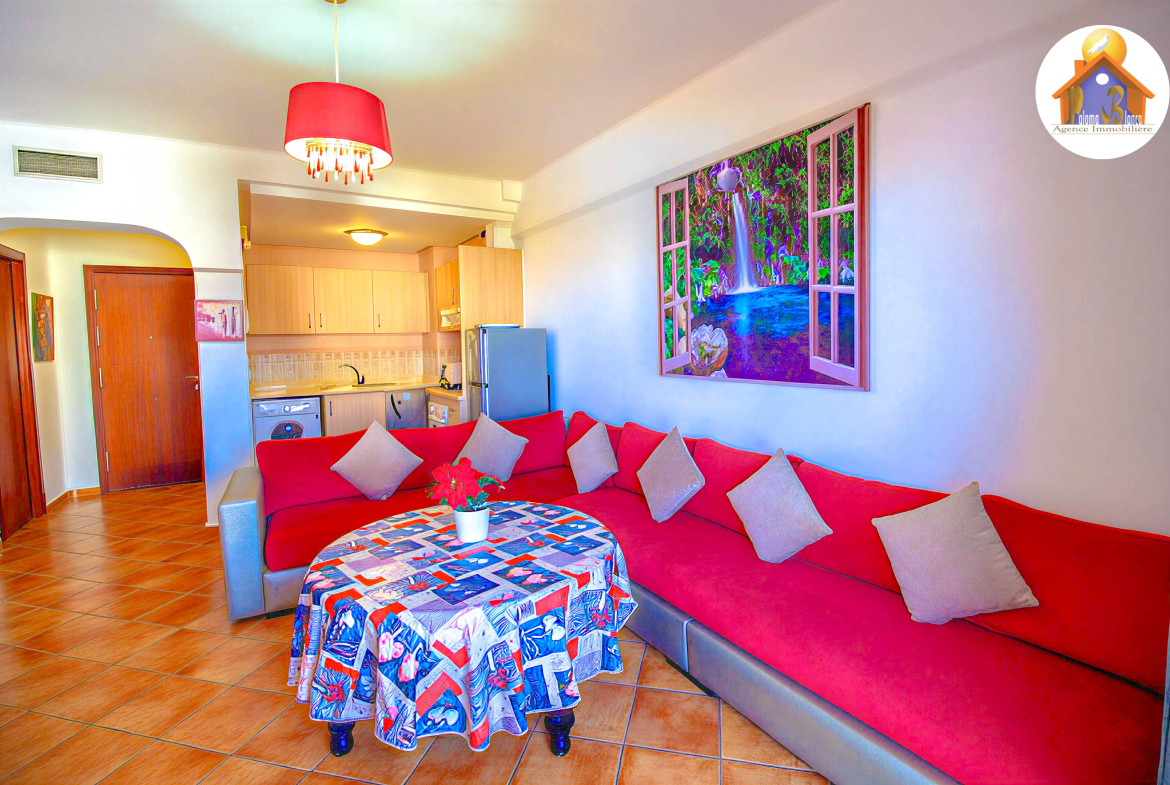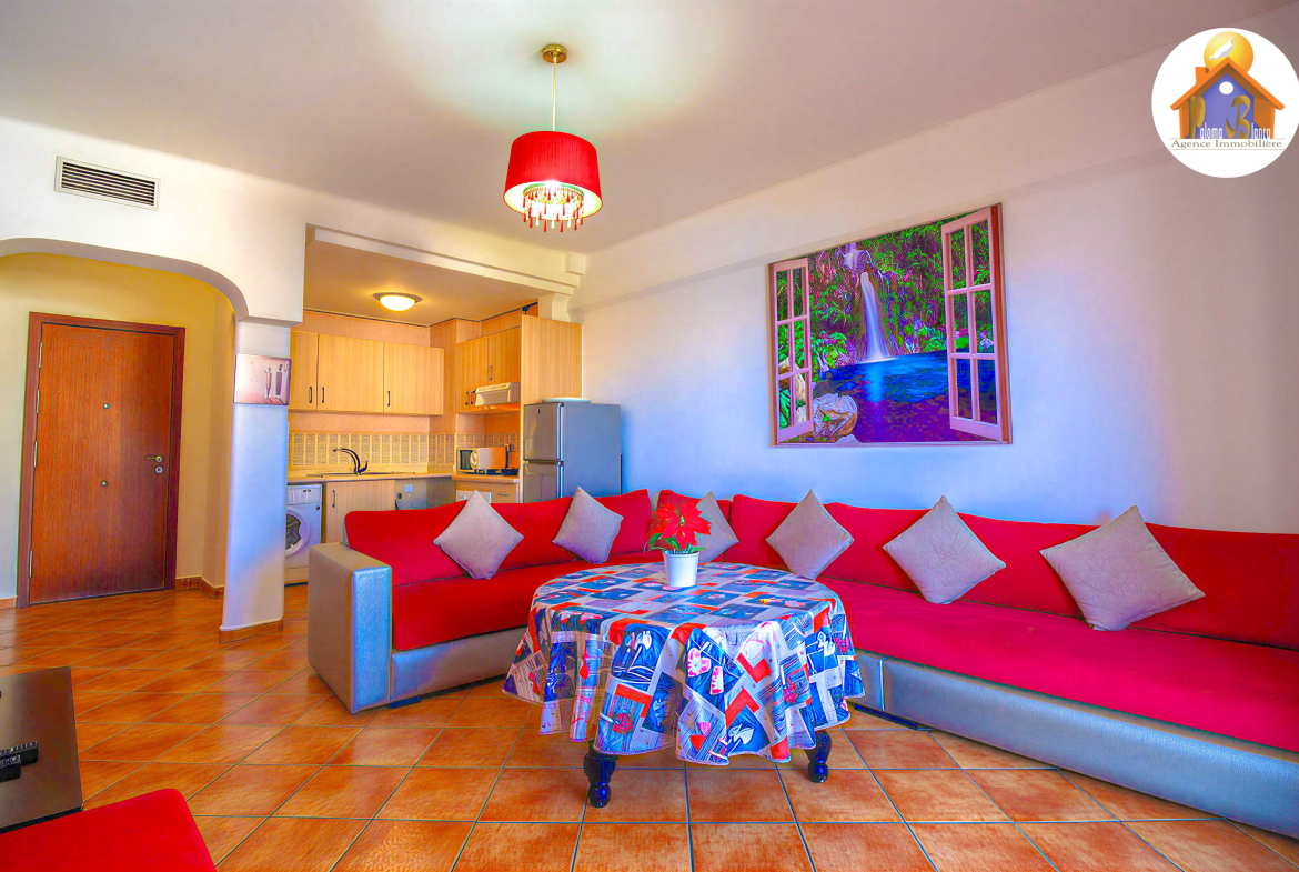 L’appartement est en deuxième étage avec ascenseur et elle se compose de : 1 Chambre à coucher , 1 Grand Salon , 1 Salle de bain , Cuisine Américaine bien équipée et une terrasse avec vue panoramique sur piscine.