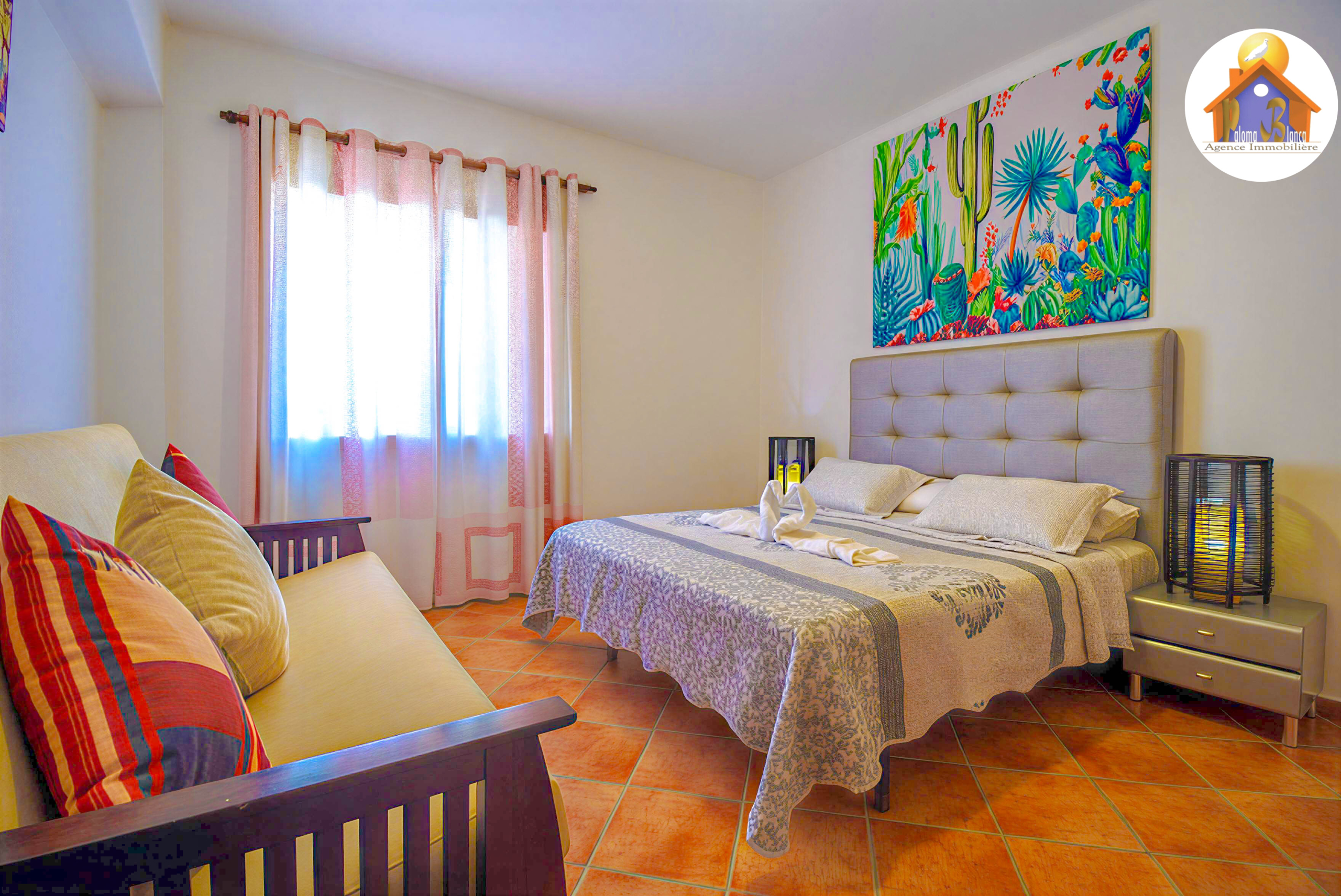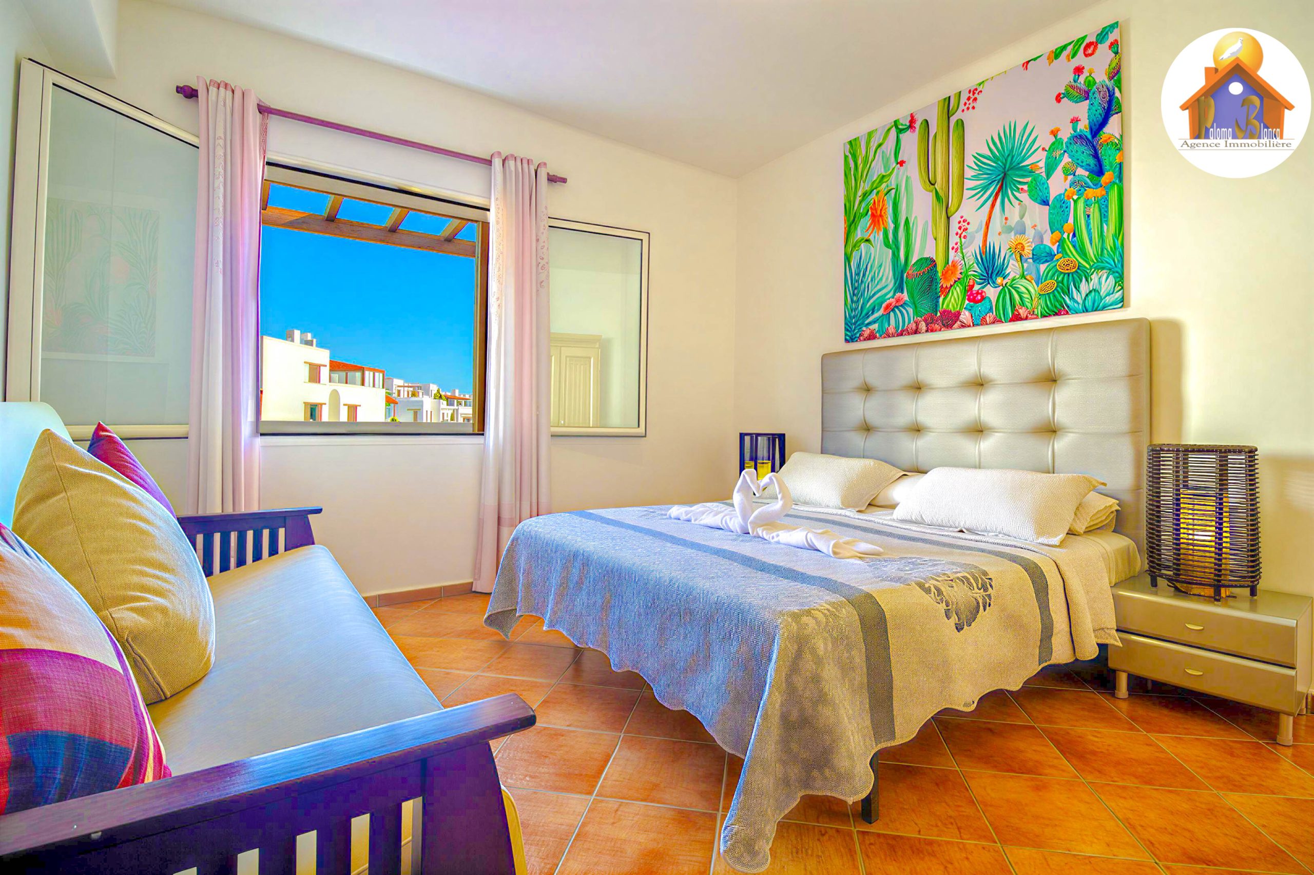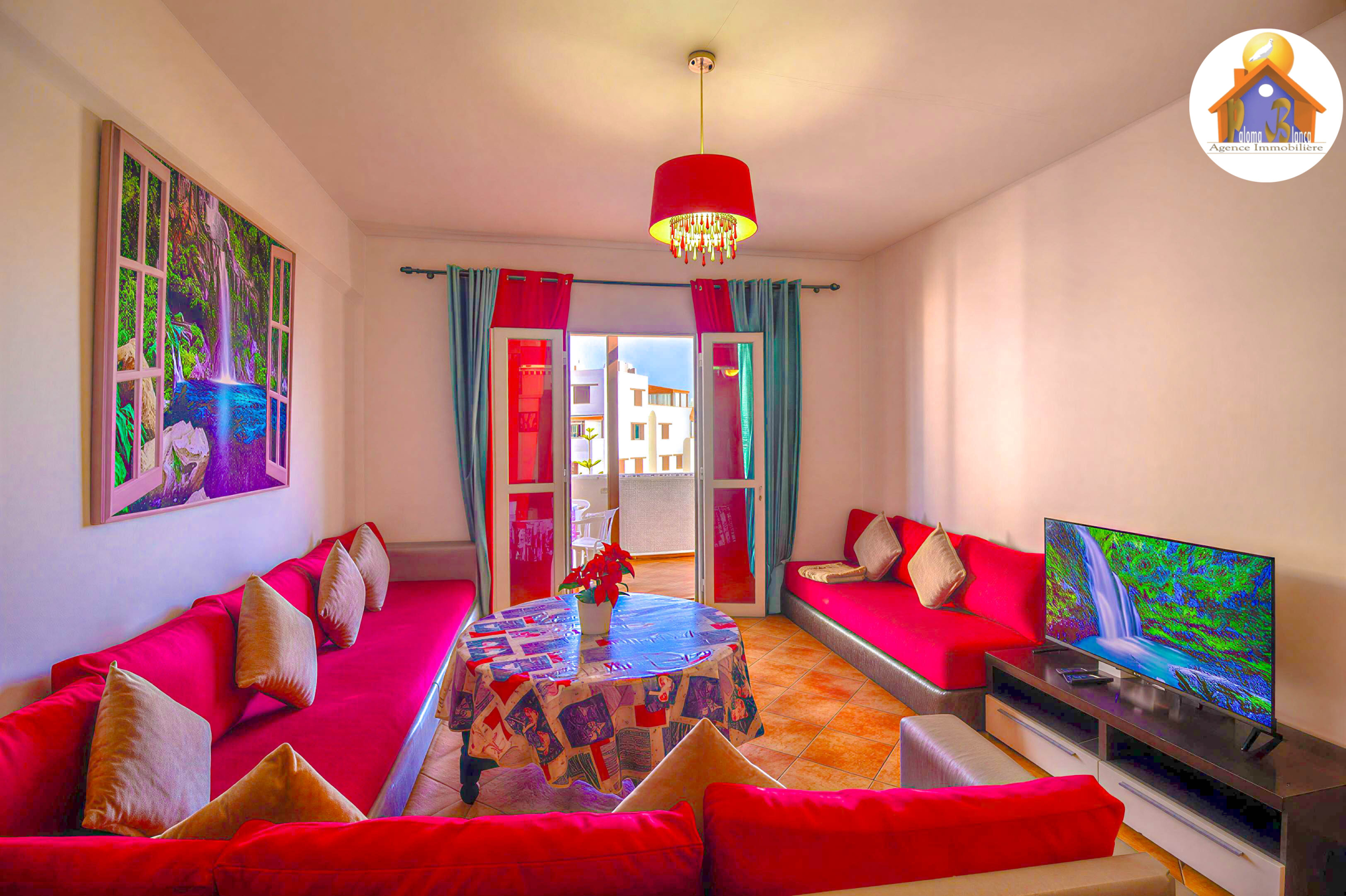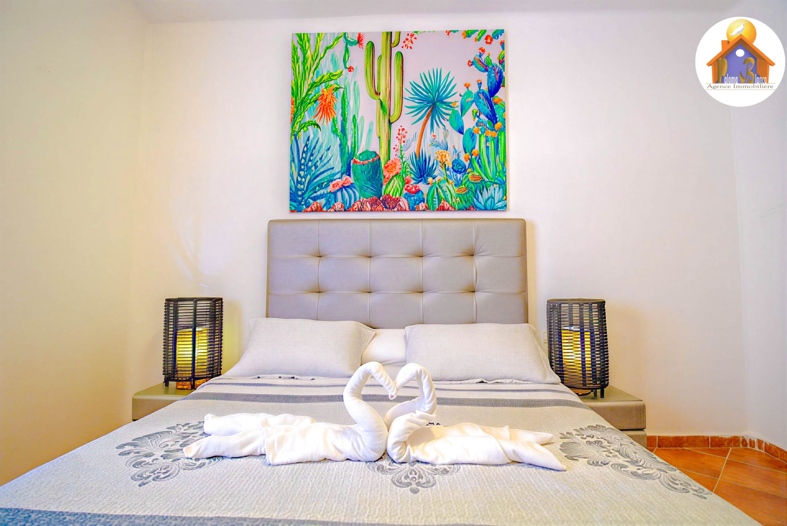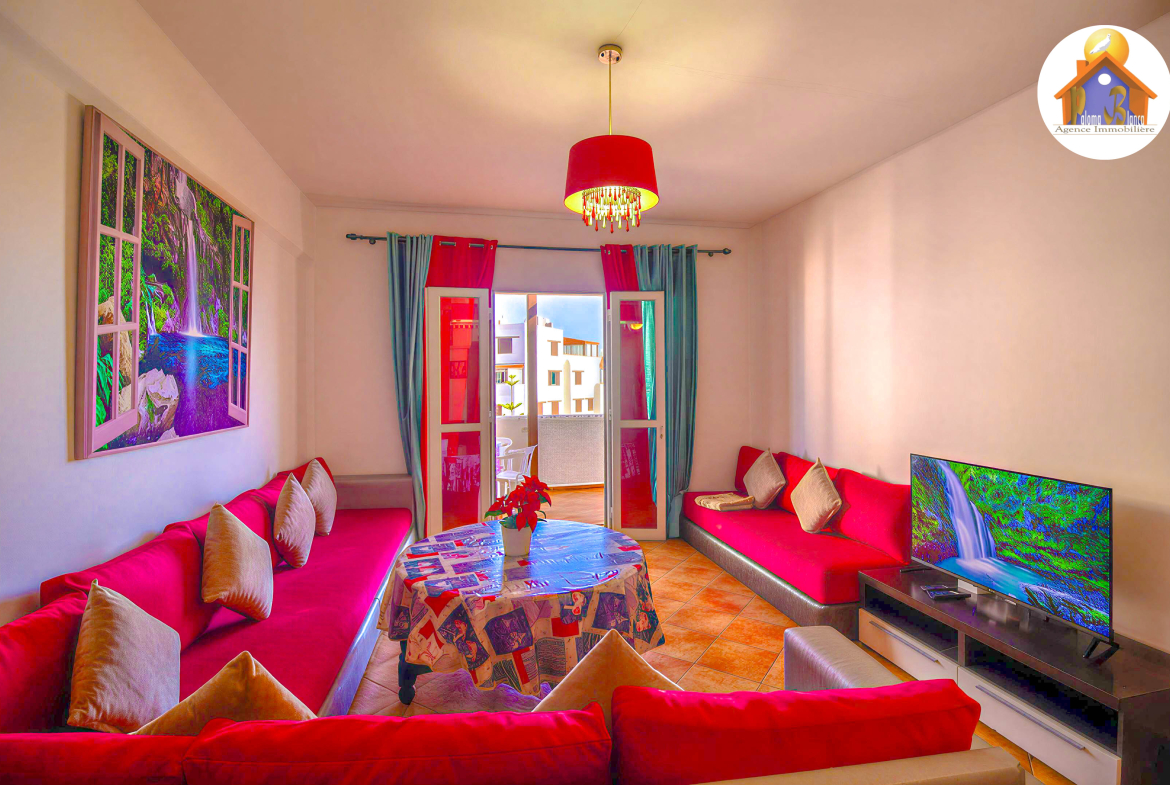 L’appartement est en deuxième étage avec ascenseur et elle se compose de : 1 Chambre à coucher , 1 Grand Salon , 1 Salle de bain , Cuisine Américaine bien équipée et une terrasse avec vue panoramique sur piscine.