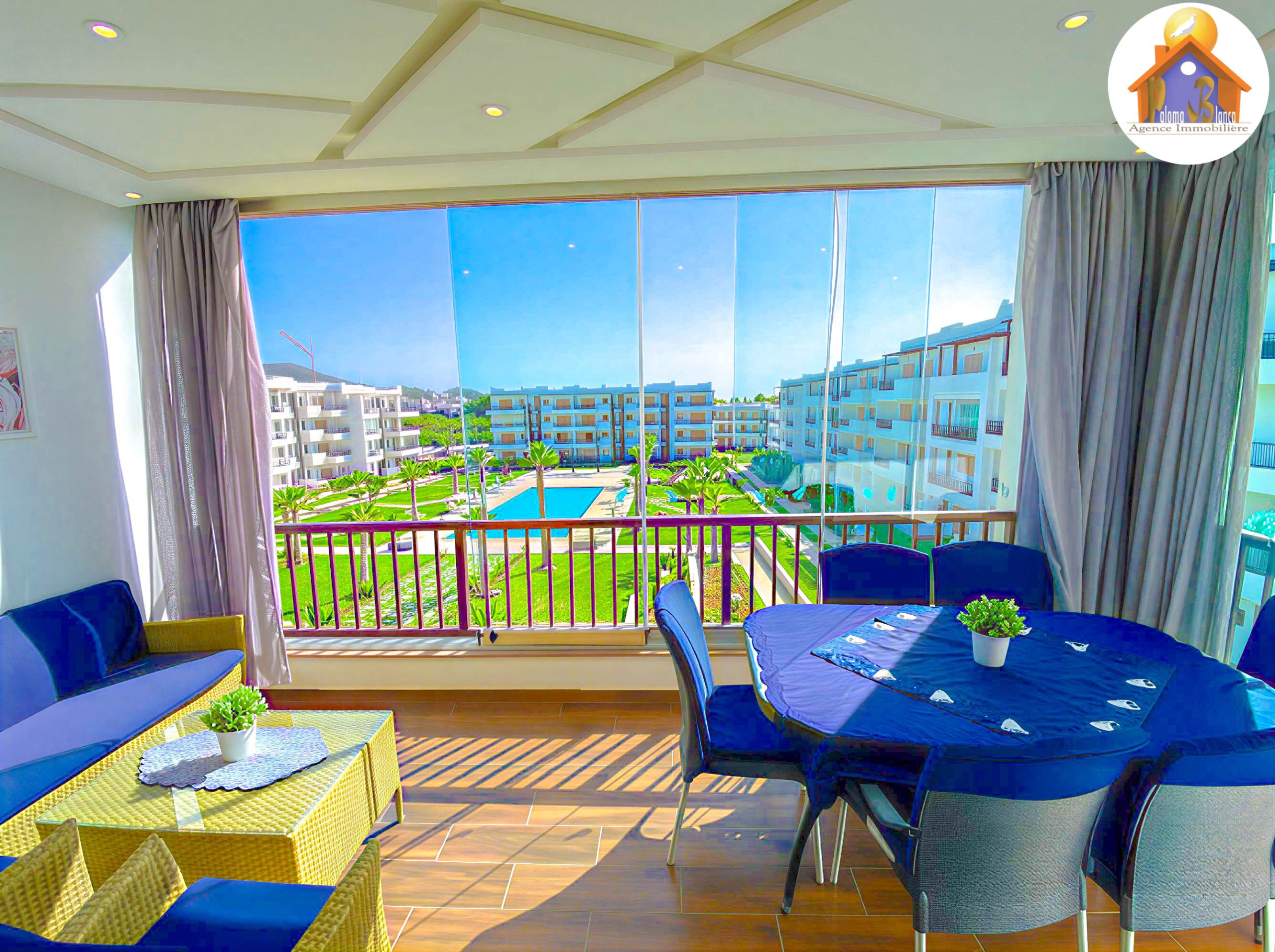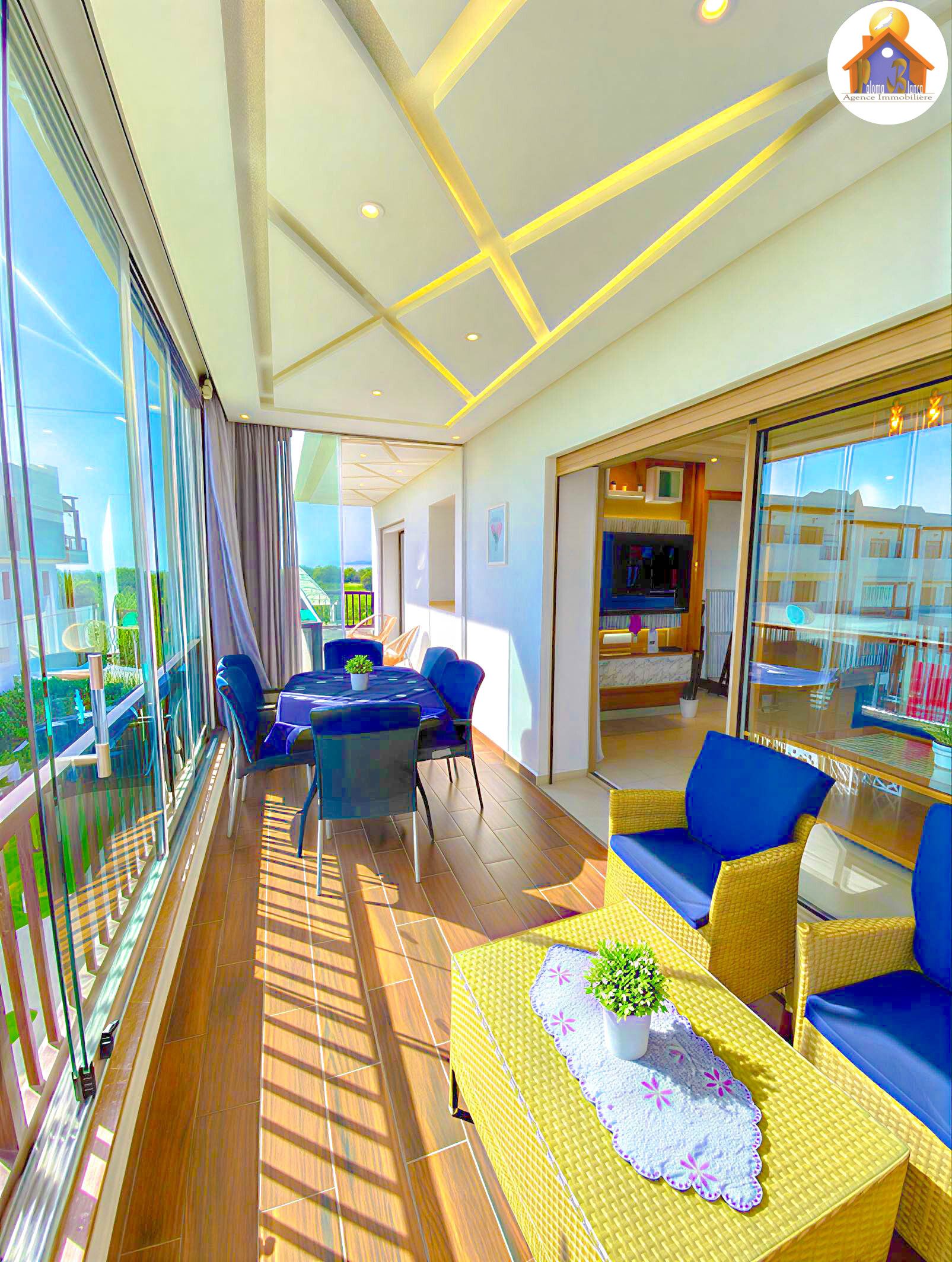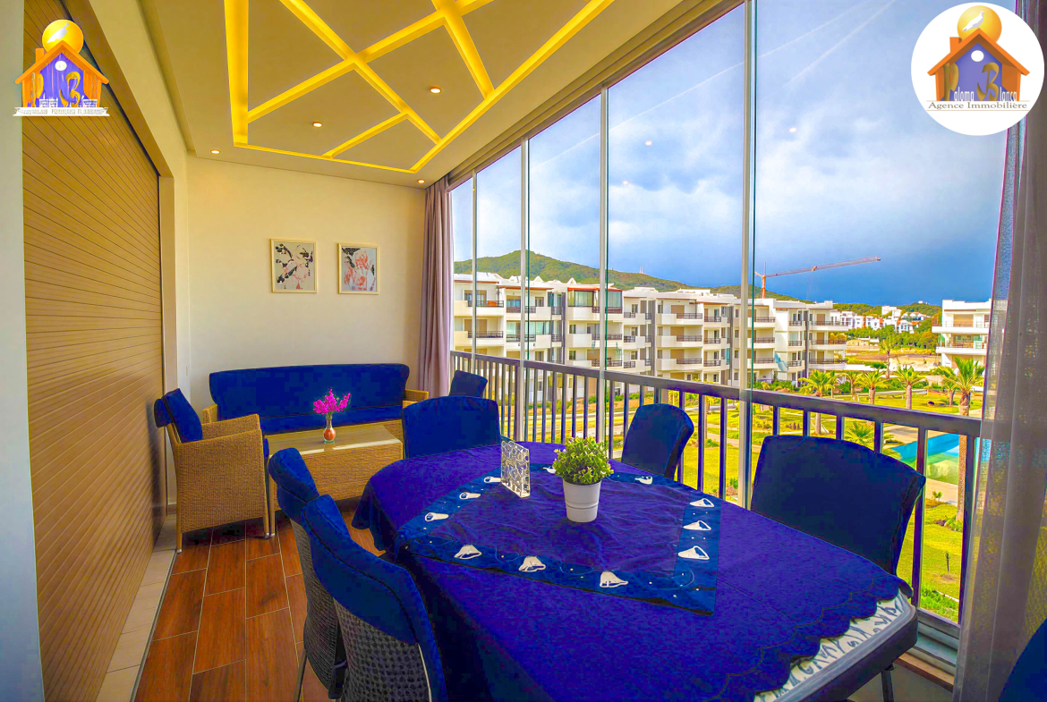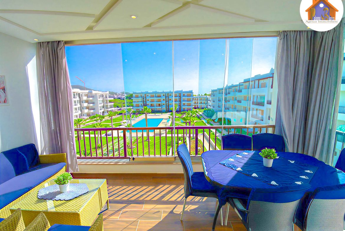 Un appartement meublé avec goût et se trouve dans une résidence de Haut – Standing à Cabo Negro ( cabo huerto ), il se caractérise par 2 grandes piscines pour les adultes et pour les enfants , jeux pour les enfants , animation , parking , sécurité