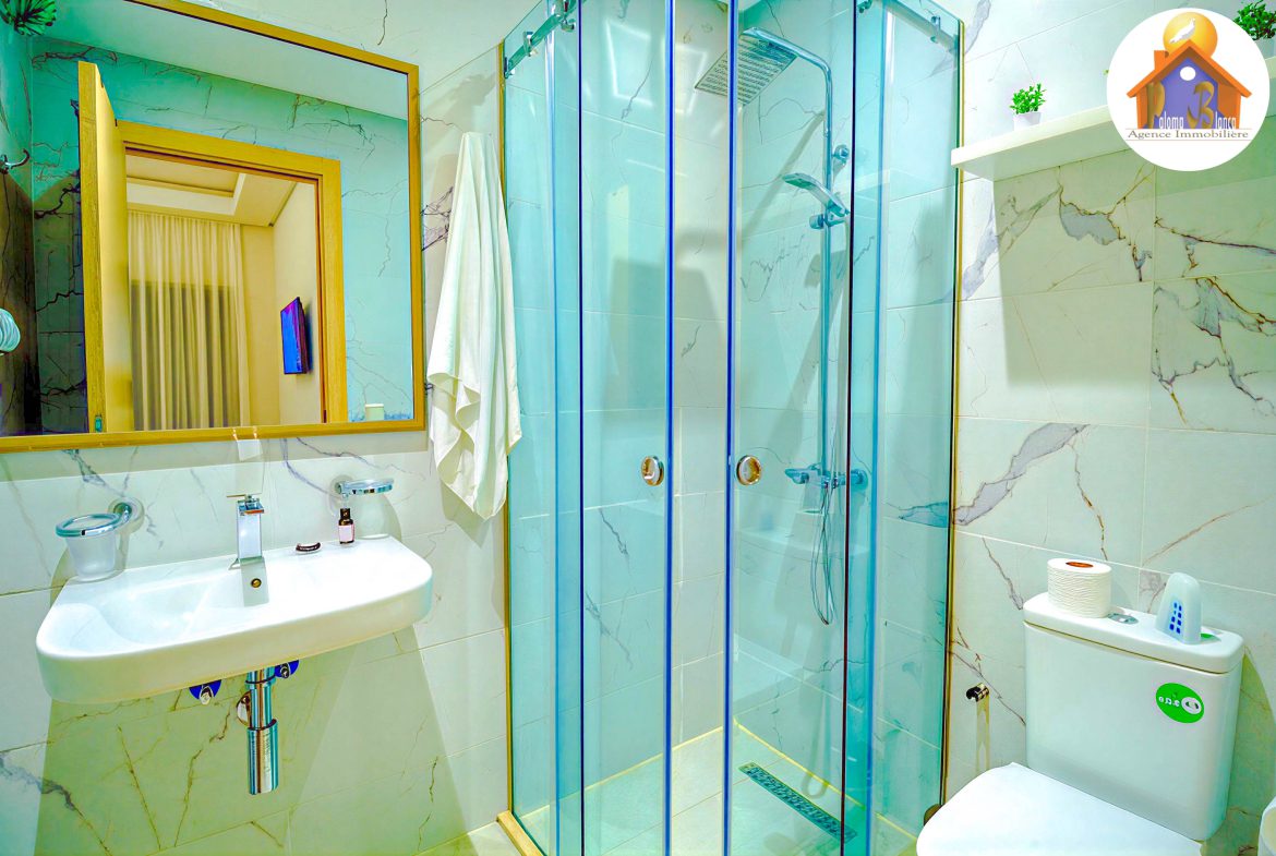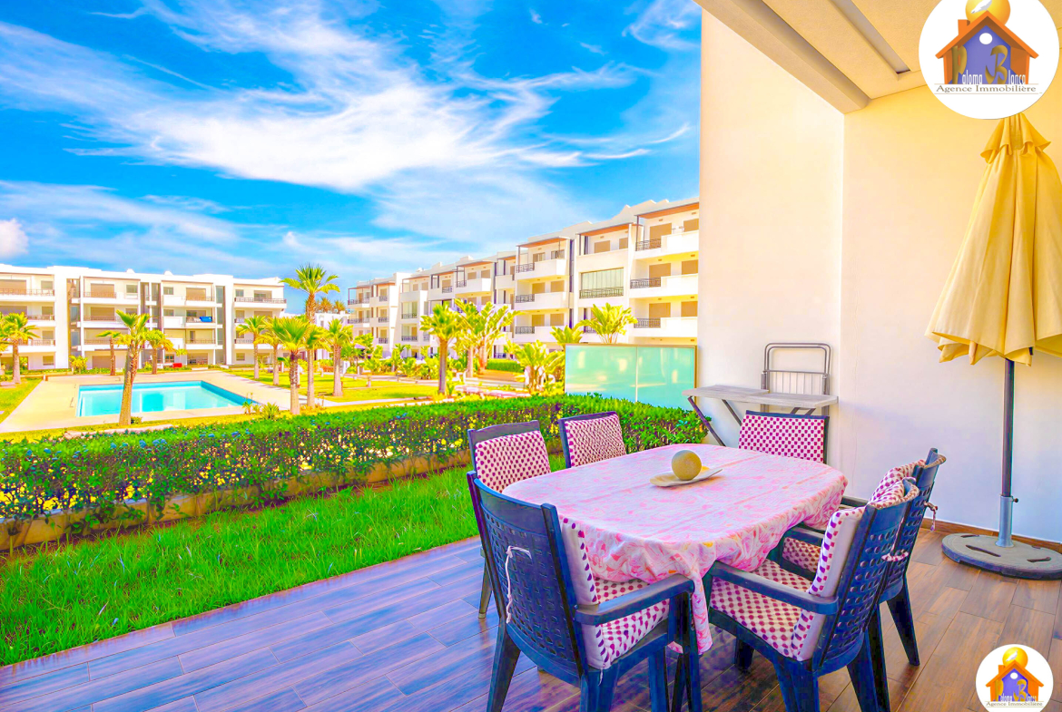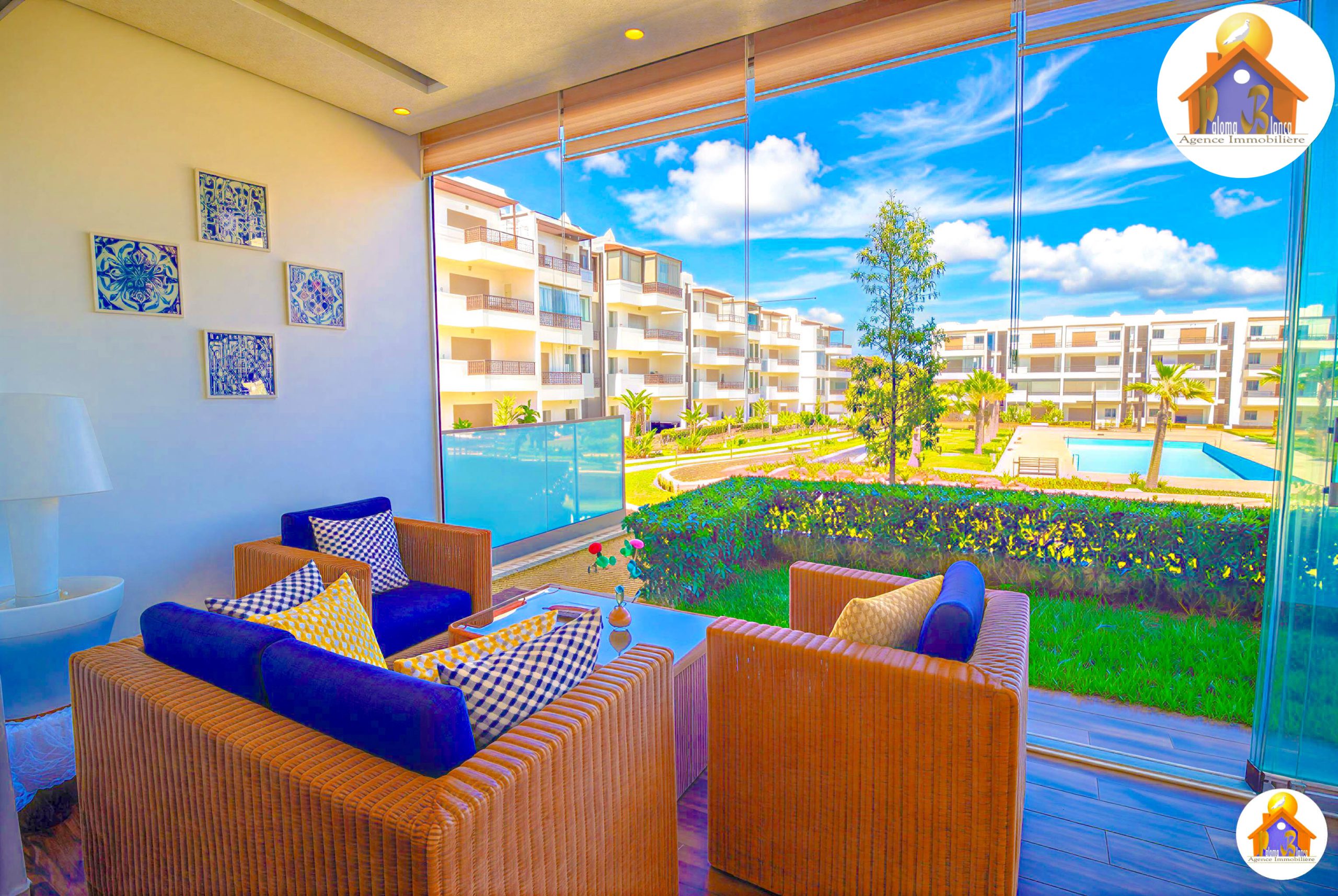 Cet appartement est en rez de chausée et composé de : 1 Chambre à coucher  , grand salon avec salle à manger , 2 SDB , Cuisine bien équipée , Grande Terrasse en face la piscine et la surface verte .
